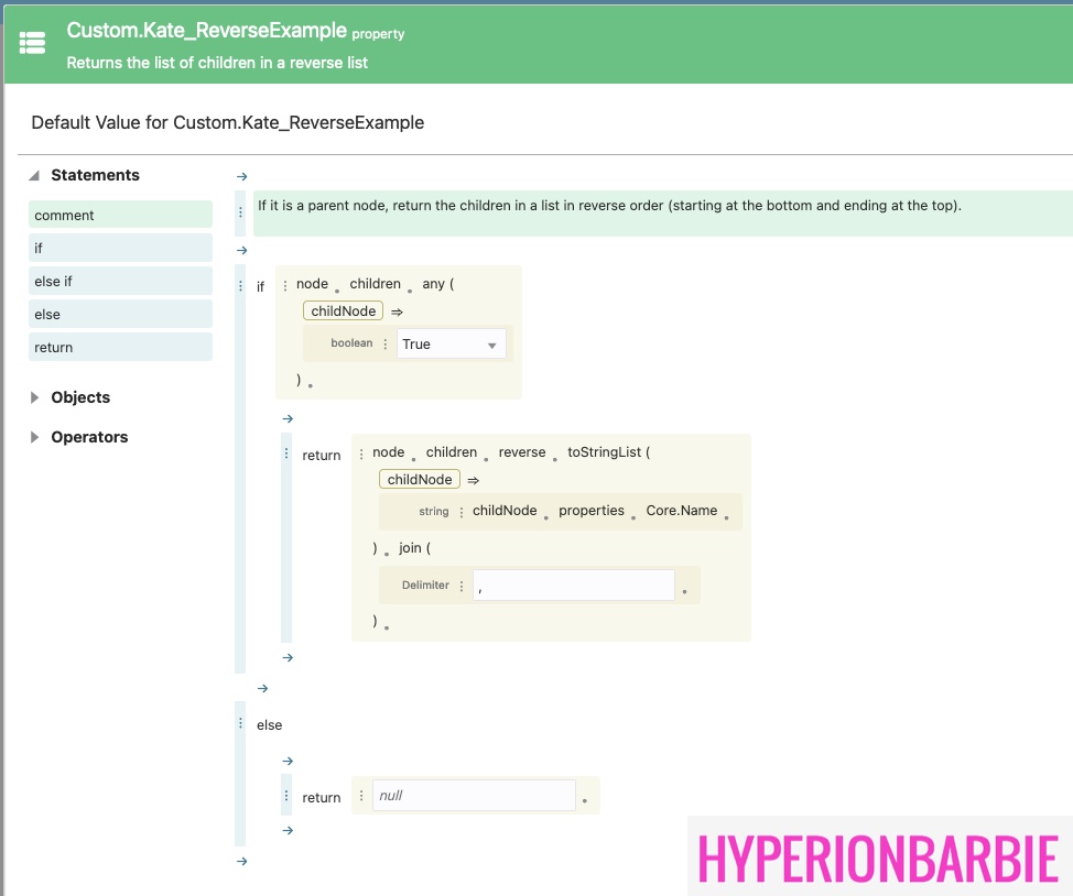 This Expression will look at parent values and return their list of children in a bottoms-up order (reverse). Note, we start with an “If” statement so it only calculates on nodes that have children (children.any = True), and do not return anything for base-level nodes (the “else” statement returning null):
