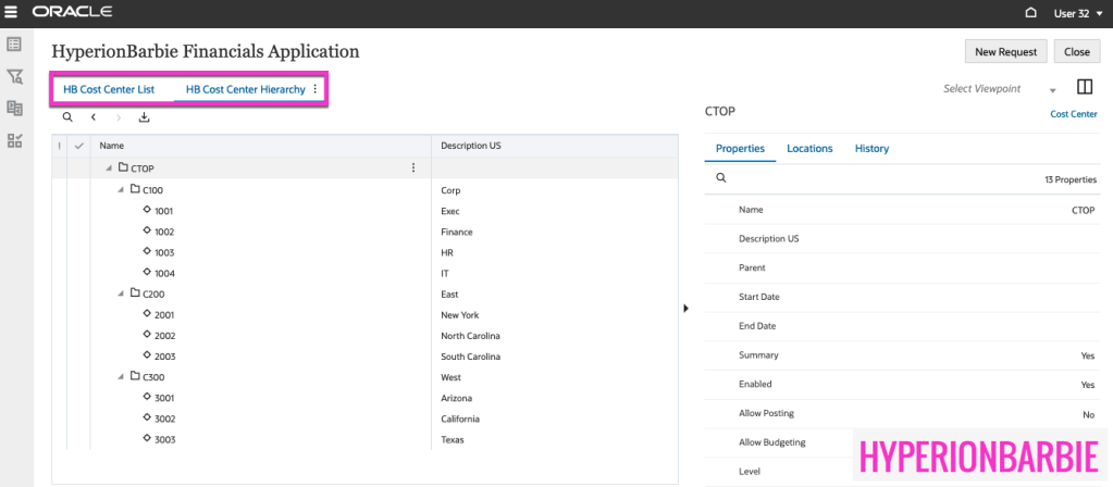 The hierarchy, shown here, shows my Cost Centers for HyperionBarbie Financials ERP. Next, I want to create a Reference Dimension to assign one of my employees to each Level 0 Cost Center.