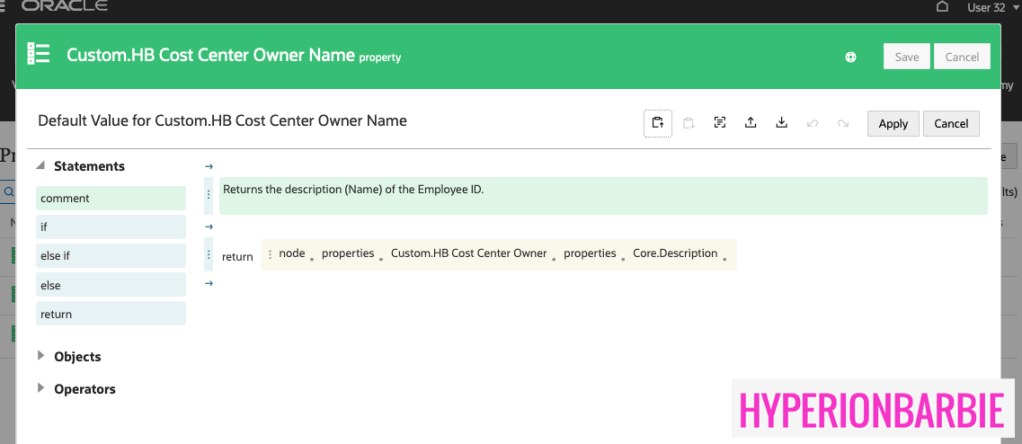 My second property, HB Cost Center Owner Name, derives the name of my Employee, based on the selection and the Reference Dimension data: