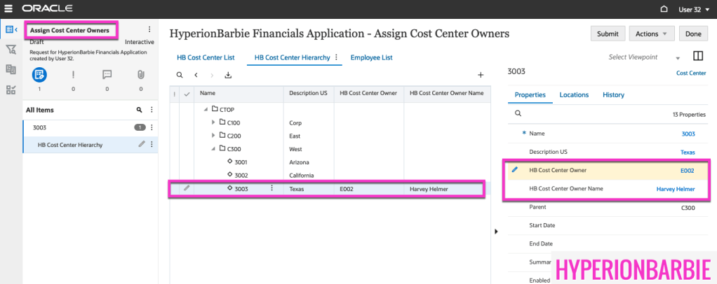 Now I’m ready to start filling in my Employees on my Cost Center viewpoint. I queue up a new request called “Assign Cost Center Owners” and find my cost center 3003, Texas.