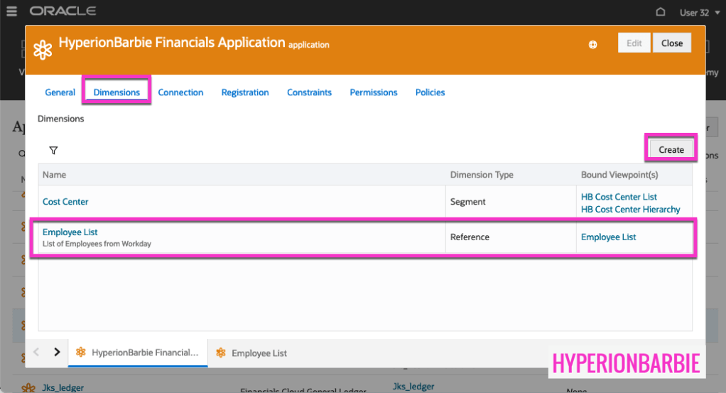 On the HyperionBarbie Financials Application, I inspect and go to the “Dimensions” tab and press “Create“. This is going to give me an option to create either an Unbound or Reference dimension. I create a Reference Dimension called “Employee List“.