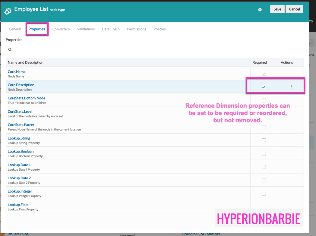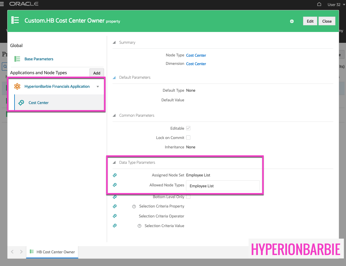 I created two properties for this: First, I created a property called HB Cost Center Owner of “Node Type” data type. This allows me to select another node in the property as a reference. You can see in the setup, once I’ve added the property to the Cost Center node type on my HyperionBarbie Financials Application, I am able to select “Employee List” Reference Dimension as the Assigned Node Set/Node Type to select: