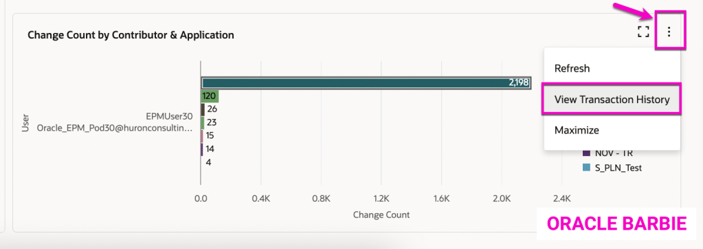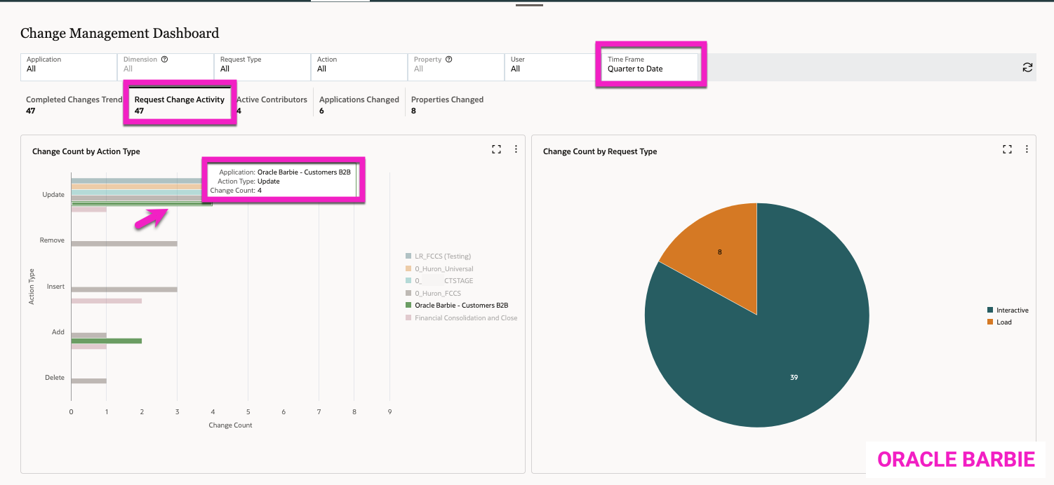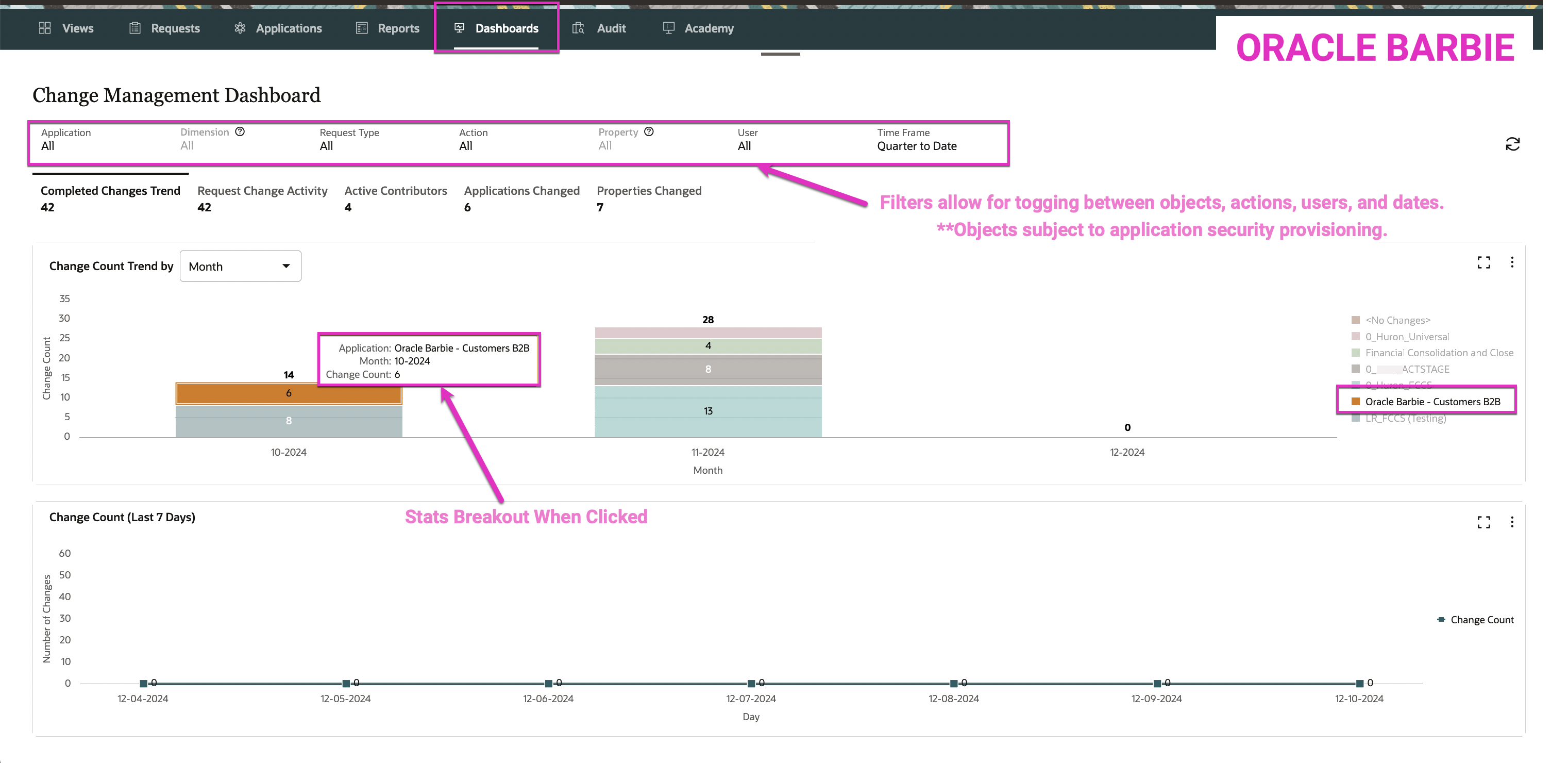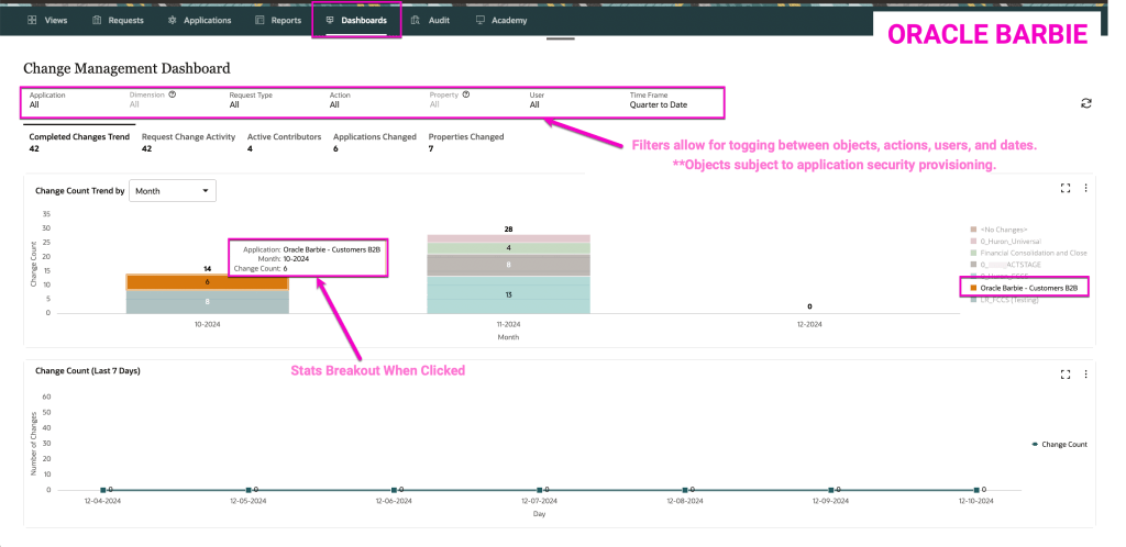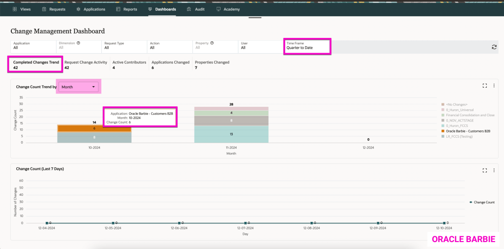 As shown below, you can see I’ve filtered on Quarter to Date, and there were 42 changes made during this time period, and in October 2024 (10-2024) there were 6 changes made to my Oracle Barbie – Customers (B2B) Application.
