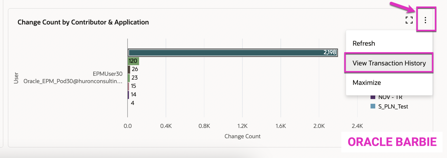 Another great feature is that for all of the data displayed on each graph/dashboard, is that you can drill into (and optionally download) the supporting transaction log history. To do so, click the 3 dots on the right-top corner of each graph and select “View Transaction History”: