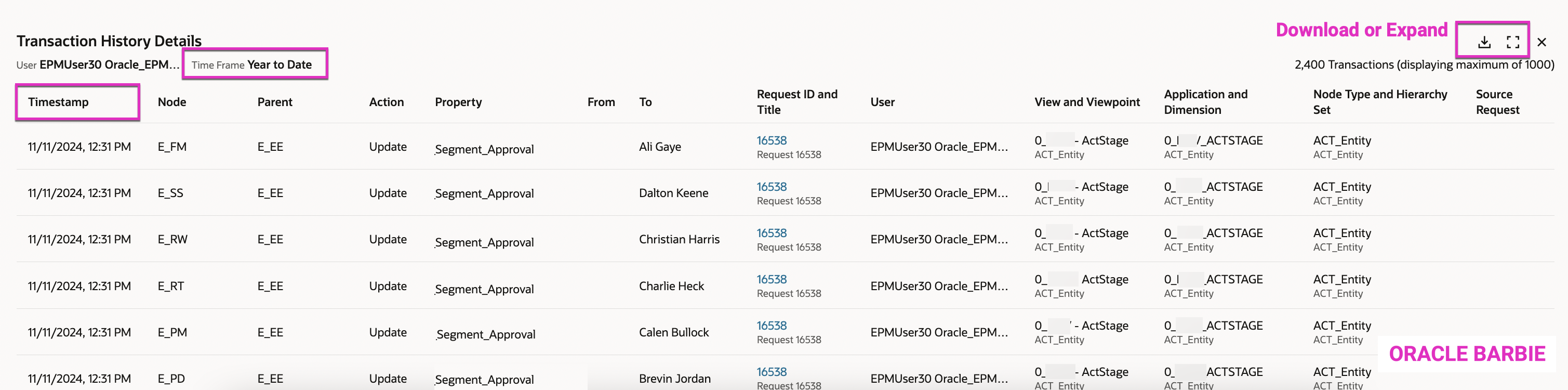 The Transaction history then pops out of the bottom of the page, about halfway through the window. From here you can expand it to be the entire webpage or download it to file, if needed. Or, you can scroll through the underlying data and click on the blue hyperlink to bring you to a specific request. One thing to note, is that currently the transaction history is ordered newest-to-oldest based on your time filter. I’d assume that in future enhancements, Oracle will allow these windows to become more dynamic and allow for sort options and/or additional filtering: