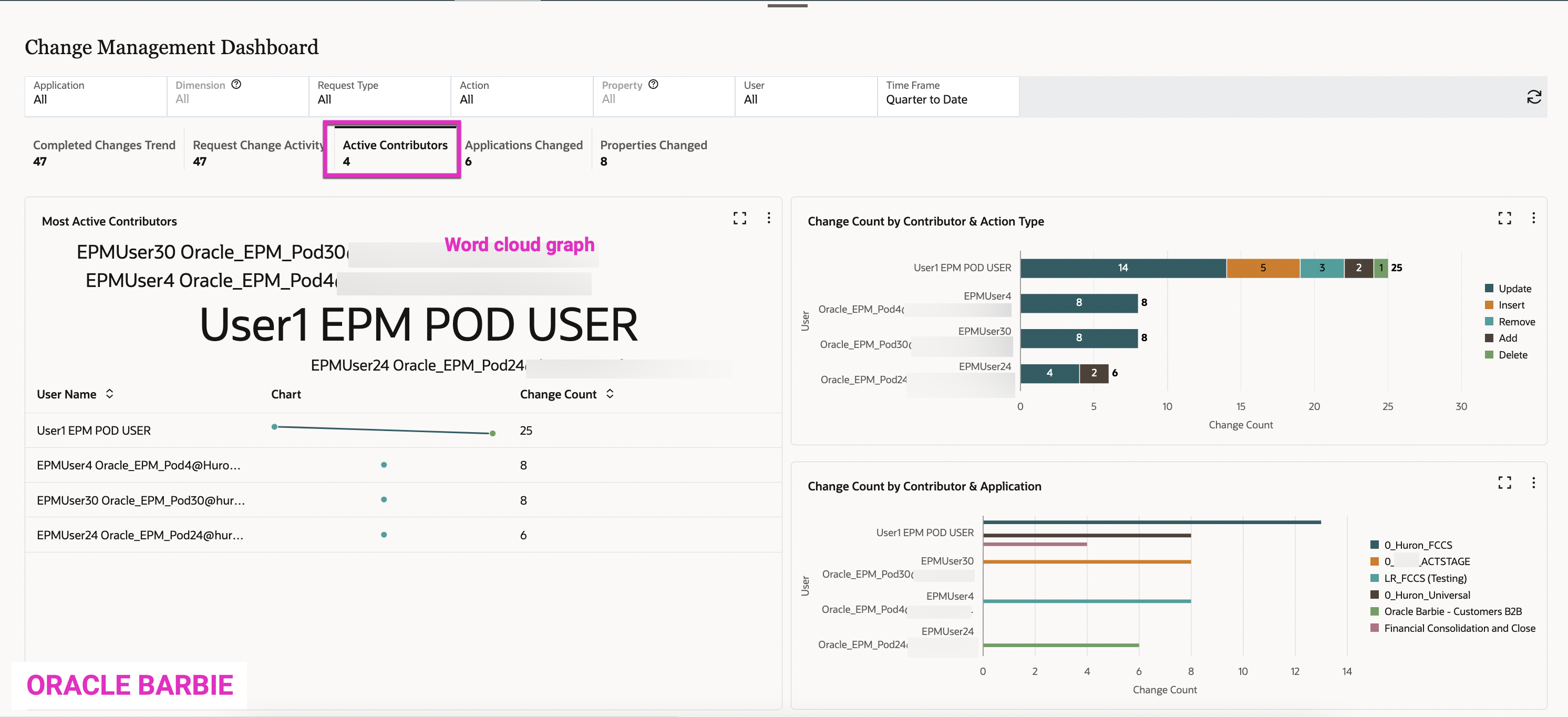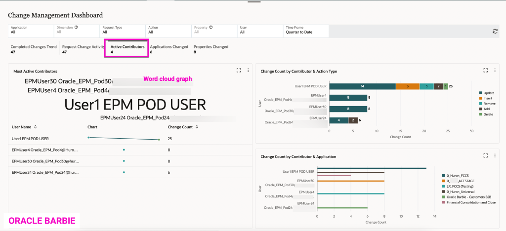 In this example below for the Change Count by Action Type dashboard on the left, you can see I have the Quarter to Date time filter selected. For this time period in my app, 47 total changes have occurred across all of my EDM applications. I’ve isolated in the “Update” Action Types that my Oracle Barbie- Customers B2B application received 4 Update changes within this time period.