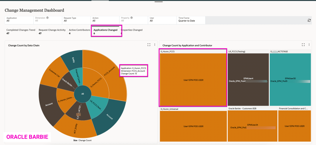 The left displays a circular heat map that breaks out the Applications and Dimensions that had the most changes. For example, in my Quarter to Date view, the 0_Huron_FCCS Application’s FCCS_Account Dimension received 13 updates.